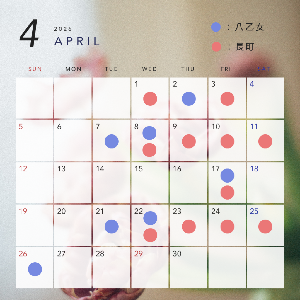 2つ印がついている日は、主に日中に八乙女、夜に長町で行っております。